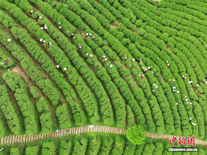 河源4月7日电 (弛璐 苦修楼)今天,广东省河源市紫金县绵亘升沉的茶山上,茶树持续流露鲜美新芽,氛围中布满着浓浓的茶喷鼻。